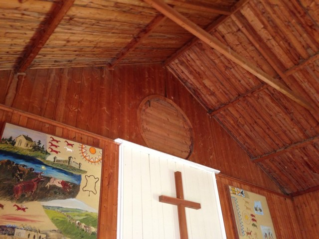 At the rear of the church there is a circular opening clearly visible. This spot was supposed to originally contain a stained glass window. Rumour has it that the window was actually manufactured in Edmonton but either prior to shipping or during transit to the site it was either lost or broken and thus no window was ever installed. Once the bell tower was constructed there was no point in adding a window here as the tower would block this opening anyway.
